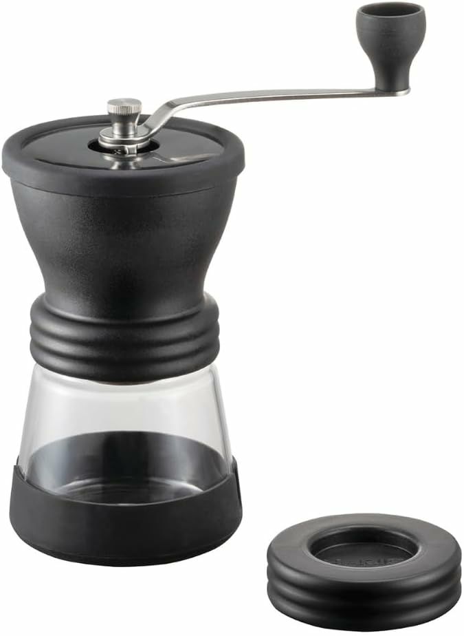 臼はセラミック製、金属部はステンレスを使用していますので、丸洗いができます。フタをすればコーヒー粉の保存容器に。ミル本体はフタの上に重ねられるので、小スペースで収納できます。滑り止めカバー付きなので安定してコーヒー豆を挽くことができます。