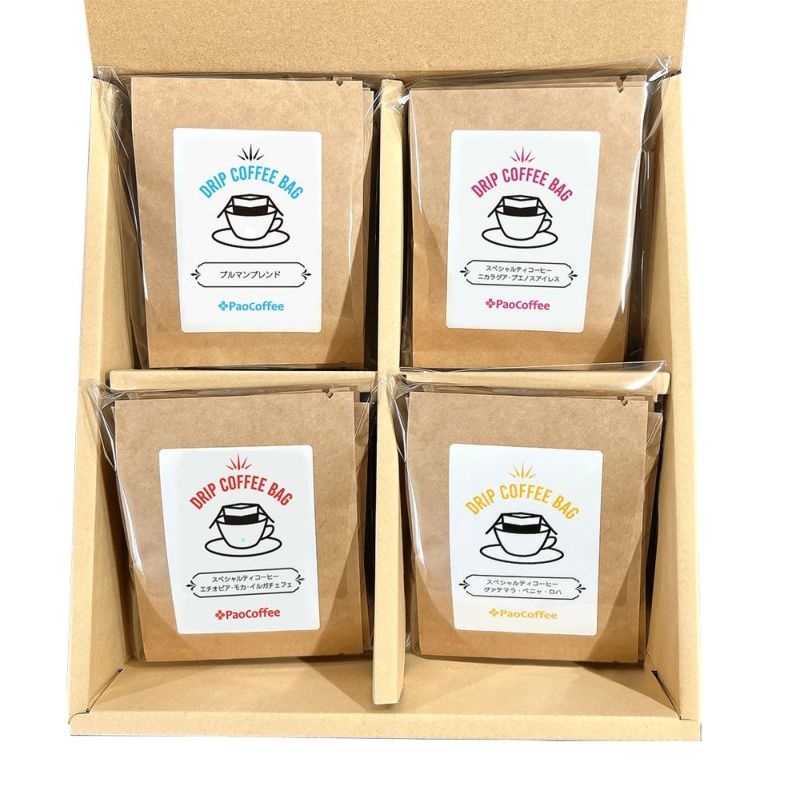 内容:ブルマンブレンド、ニカラグア・ブエノスアイレス、エチオピア・モカ・イルガチェフェ、グァテマラ・ペニャ・ロハが各5個ずつ合計20個入り。