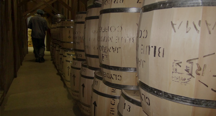 木製サイロの通路脇に樽詰めされたブルーマウンテン。通路の両奥にパーチメントが熟成保管されています。