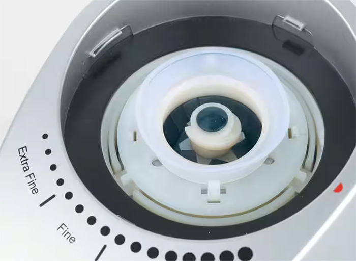 コーン式(円錐形)のグラインダーは低速回転でコーヒー豆を挽くため、摩擦熱が発生しにくい構造です。コーヒーの命ともいえる揮発性のアロマを逃さずに、プロペラ式よりも均一な粒度に挽くこともでき、安定した美味しさをお楽しみいただけます。